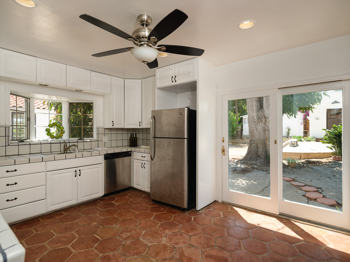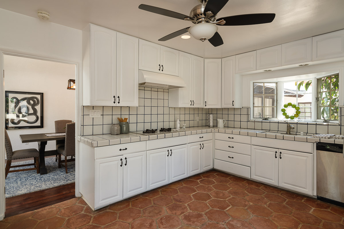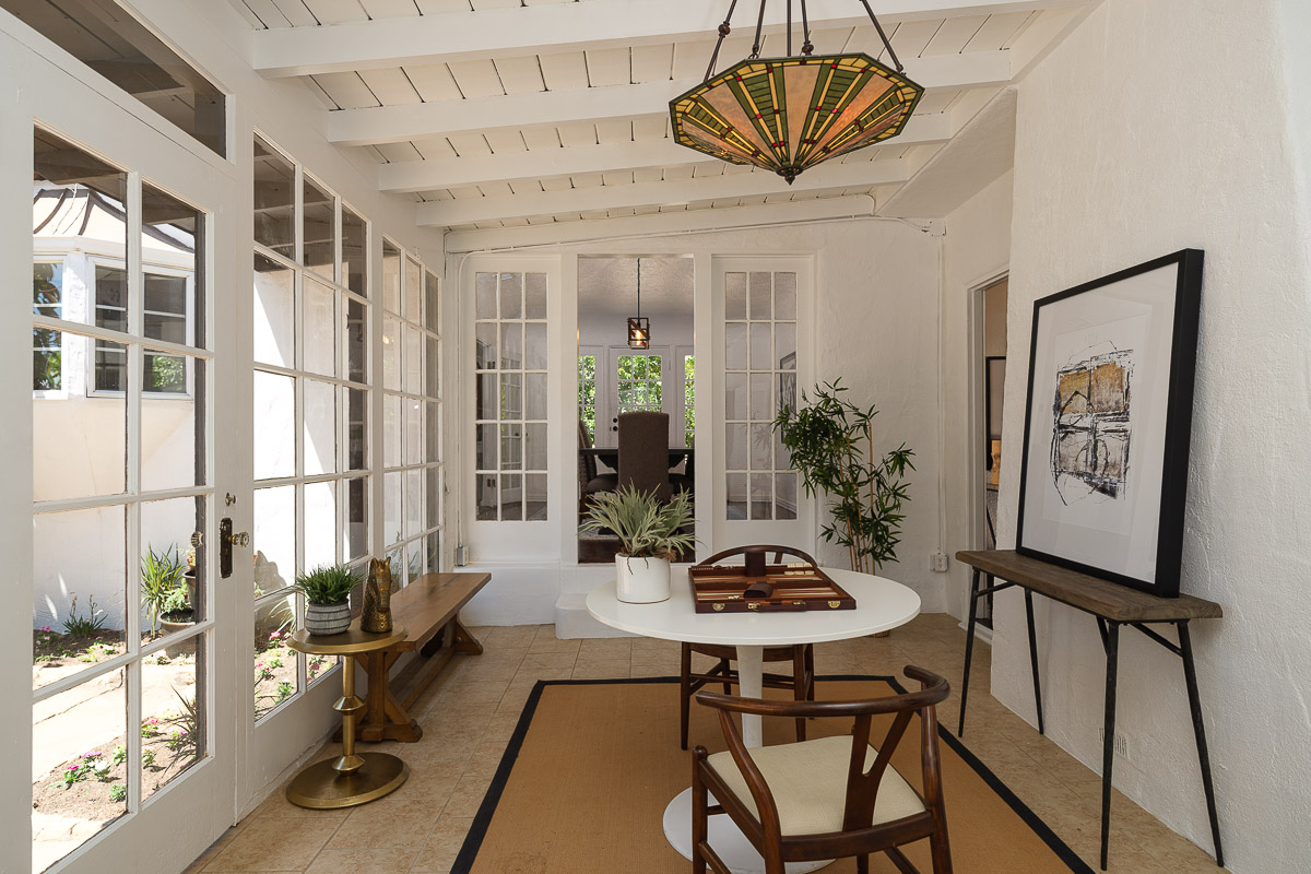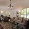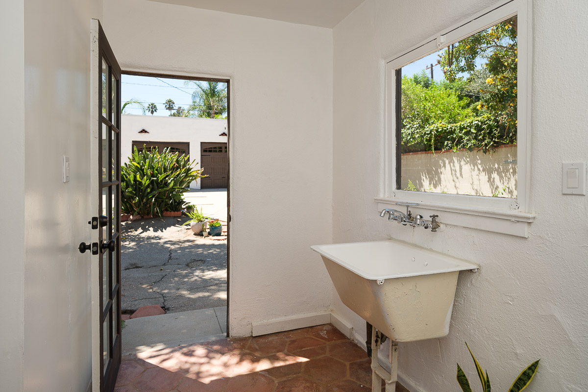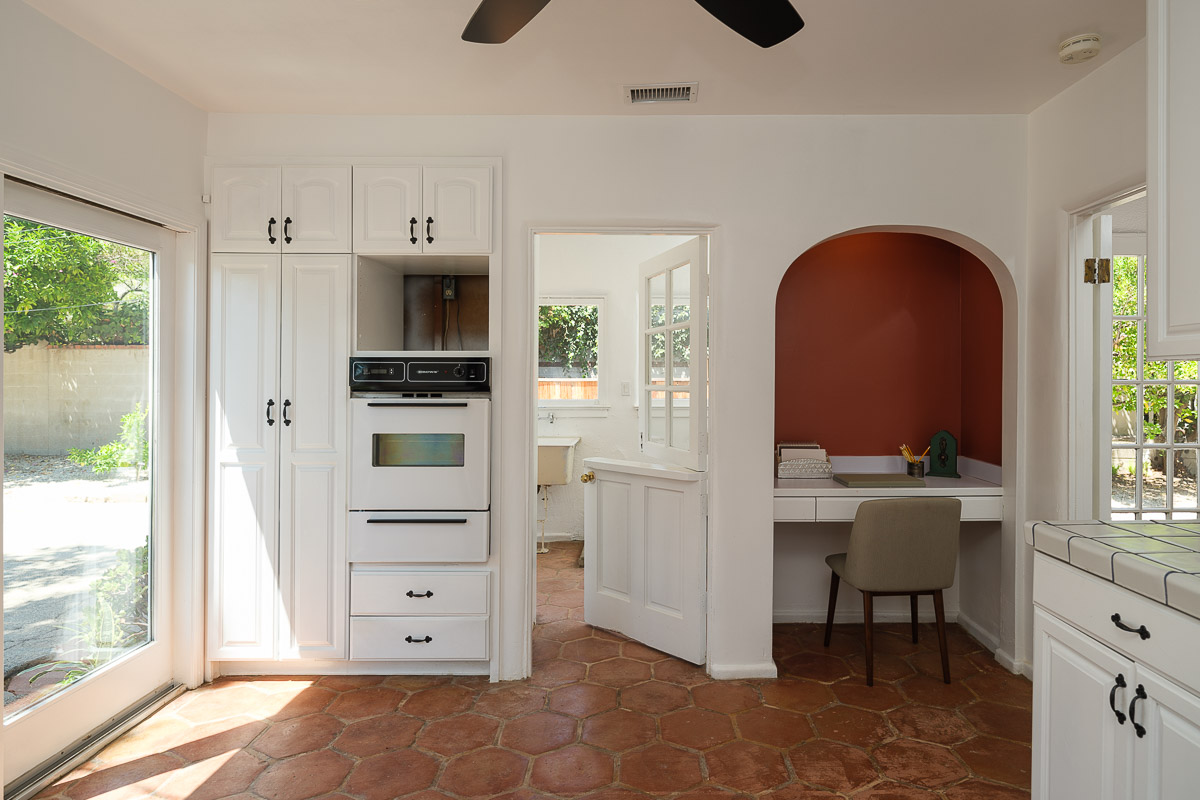 The residence has incredible character details throughout. You are welcomed in via an expansive living room with a soaring arched front window and tall ceilings. From there you step up to the formal dining room, wrapped in windows, that leads to a light filled sun or family room, with wide cross beams, and a wall of windows. There is a sunlit kitchen with white cabinetry, a built-in office nook and handcrafted hexagonal, Saltillo tile. In addition, there is a large utility or laundry room. The interior is filled with old-world, architectural details including period fixtures, a stately fireplace, 1920’s tile, gleaming polished wood floors and so much more.