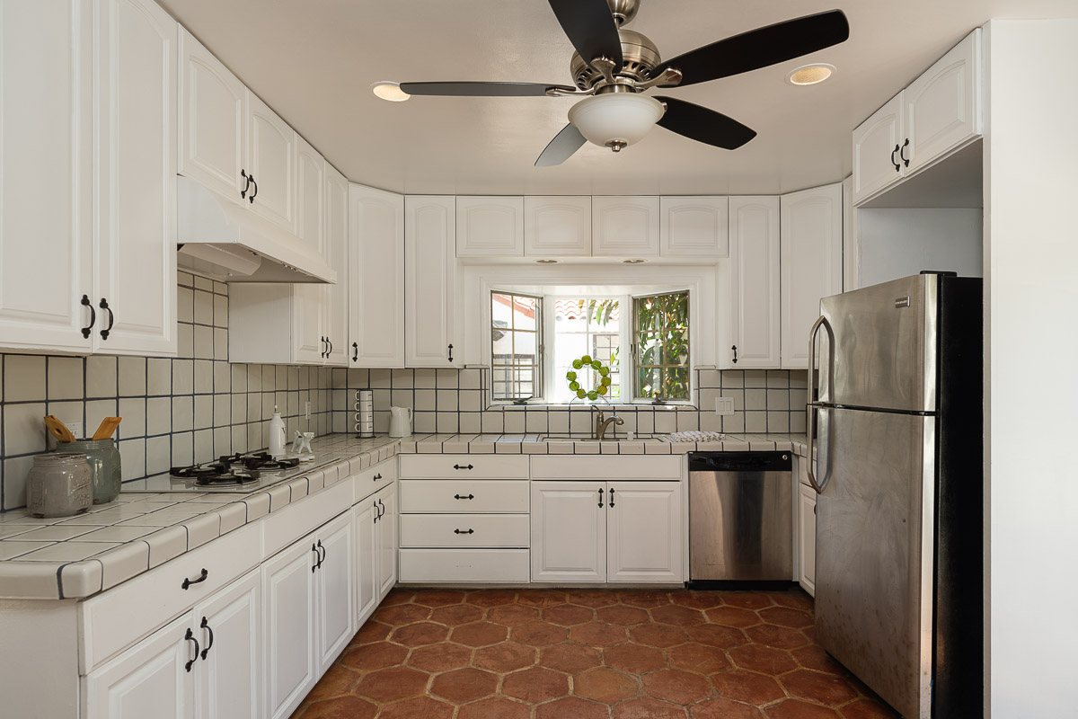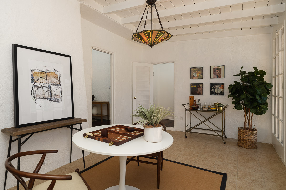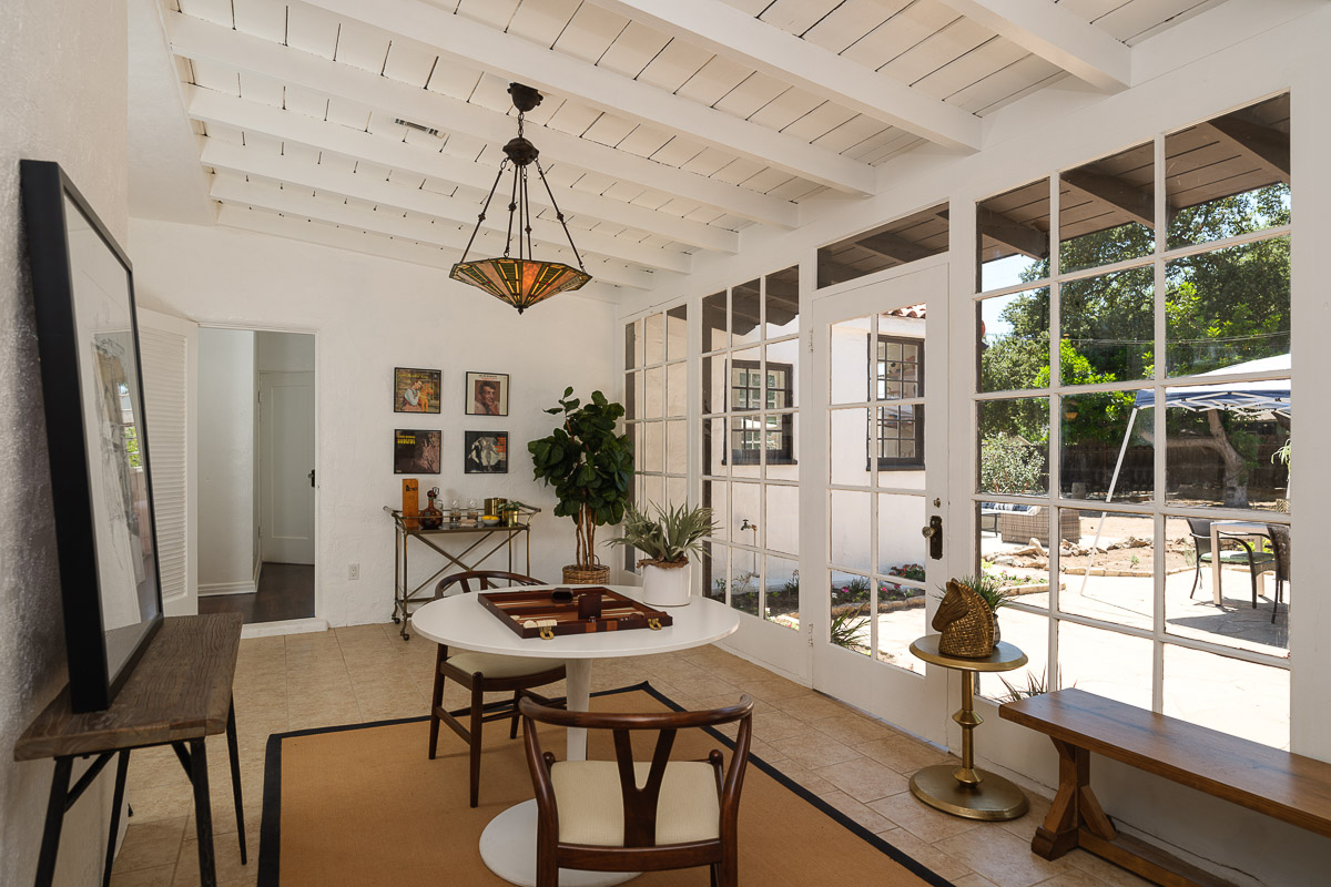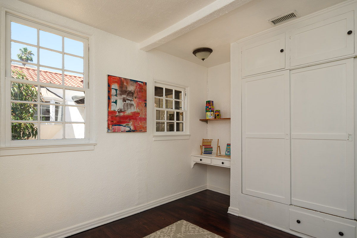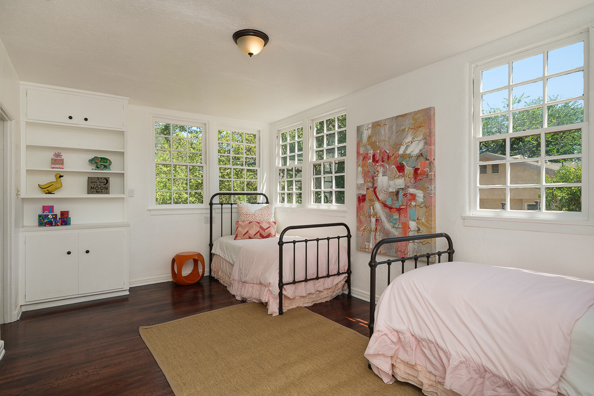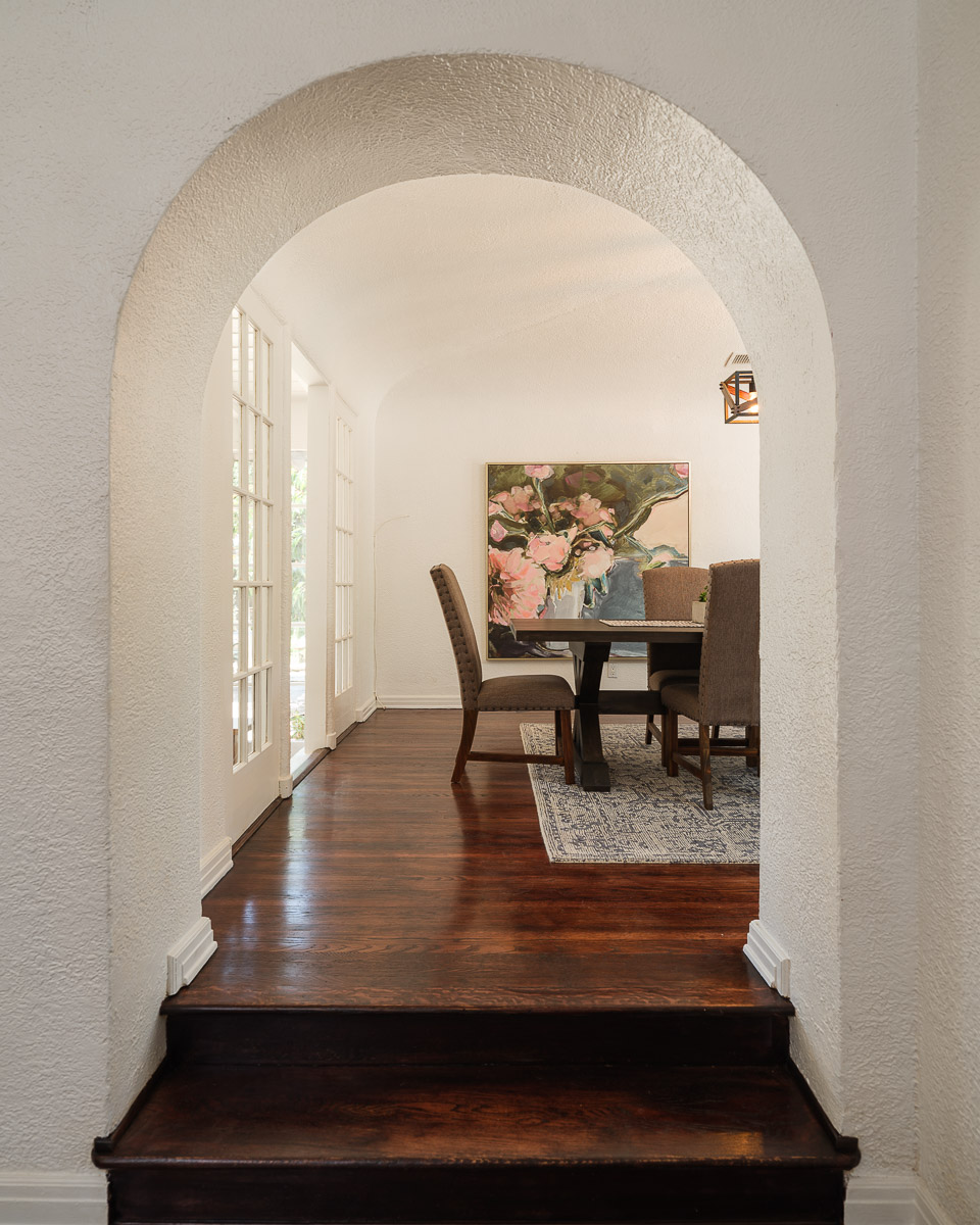 The residence has incredible character details throughout. You are welcomed in via an expansive living room with a soaring arched front window and tall ceilings. From there you step up to the formal dining room, wrapped in windows, that leads to a light filled sun or family room, with wide cross beams, and a wall of windows. There is a sunlit kitchen with white cabinetry, a built-in office nook and handcrafted hexagonal, Saltillo tile. In addition, there is a large utility or laundry room. The interior is filled with old-world, architectural details including period fixtures, a stately fireplace, 1920’s tile, gleaming polished wood floors and so much more.