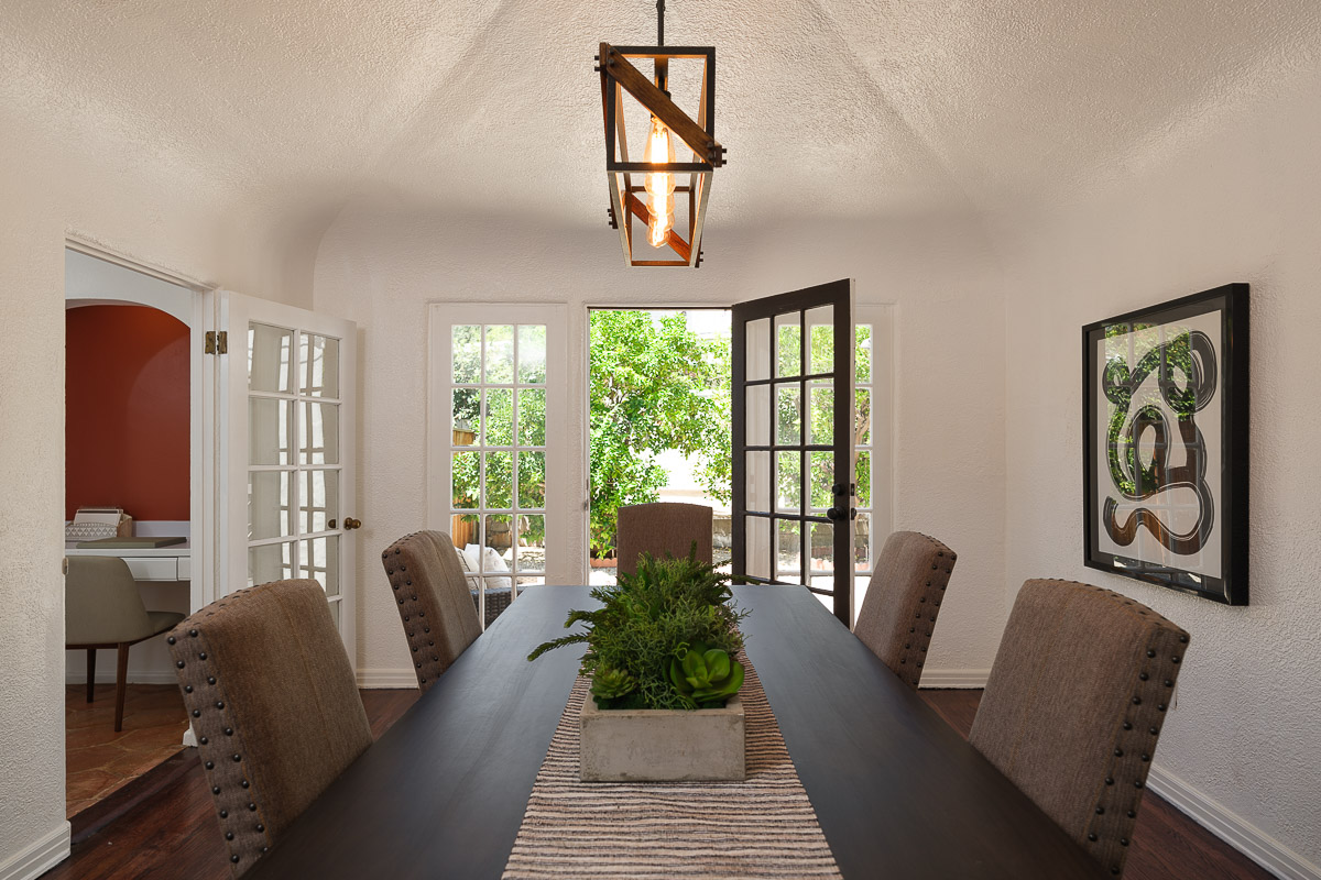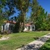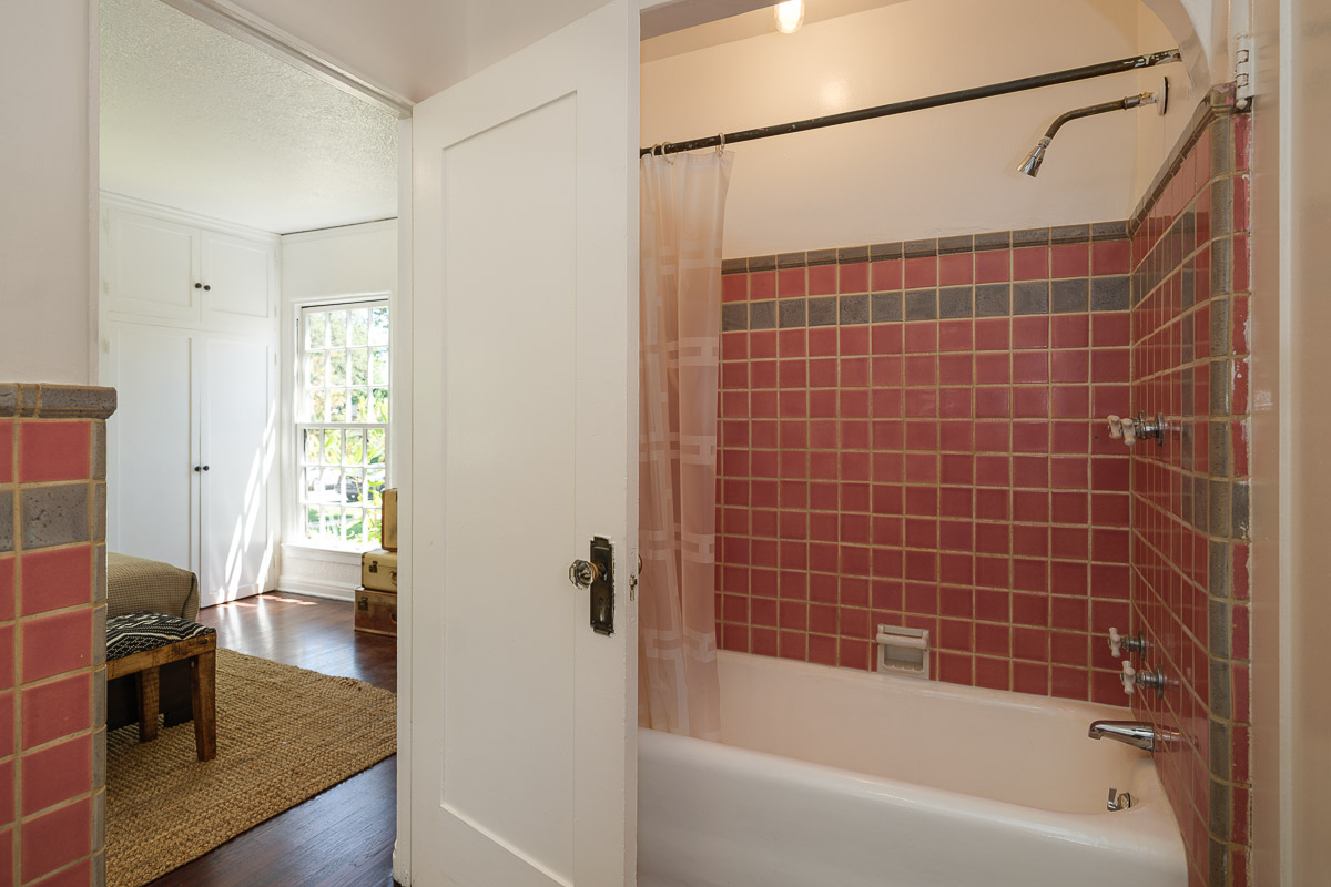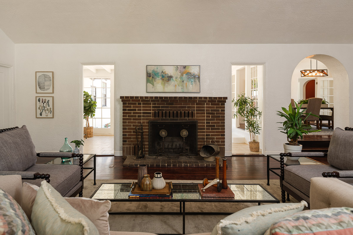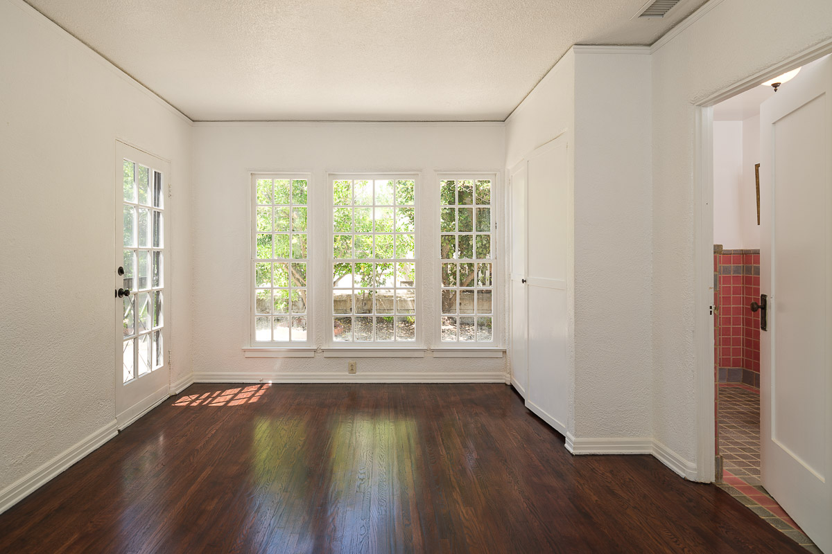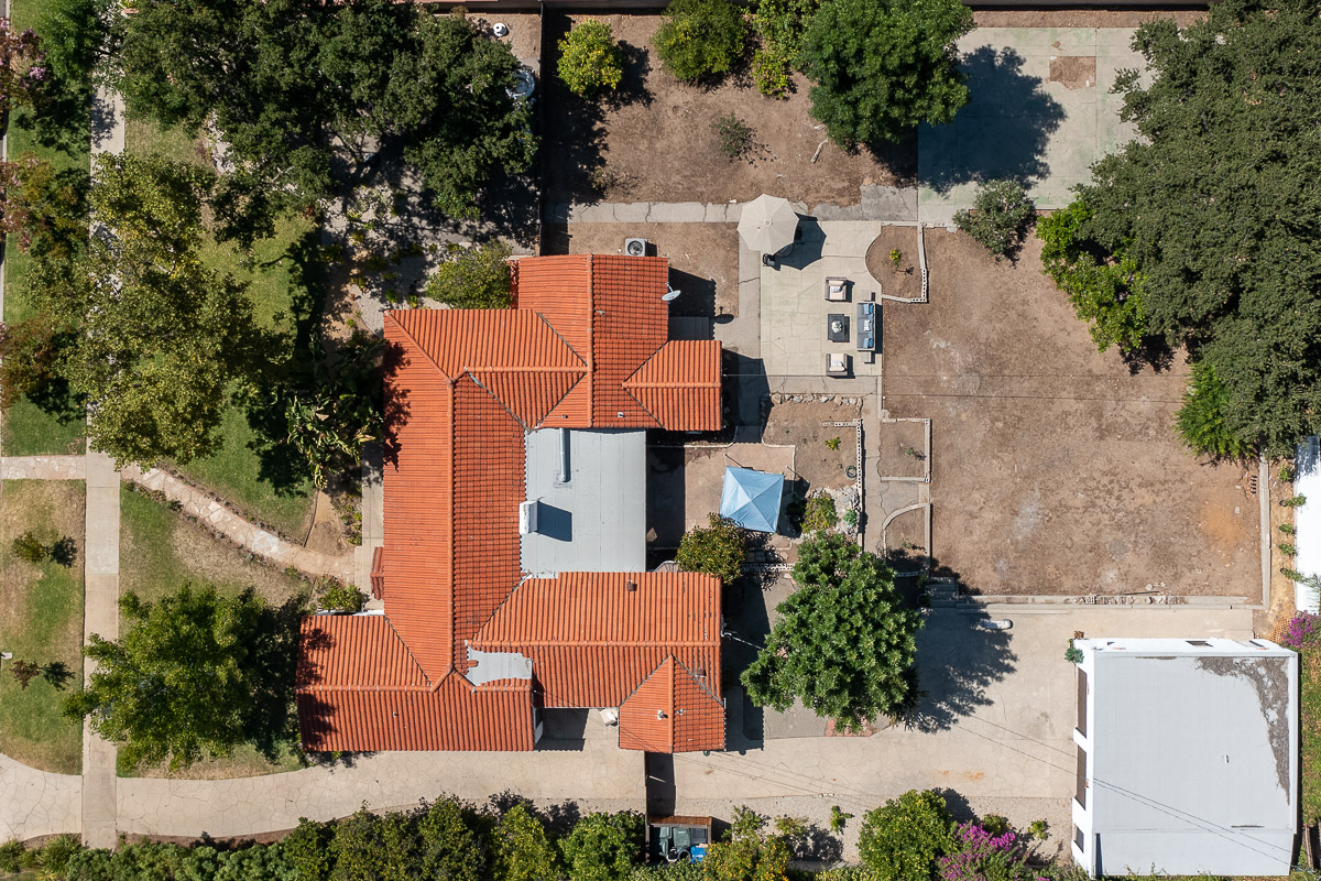 The residence has incredible character details throughout. You are welcomed in via an expansive living room with a soaring arched front window and tall ceilings. From there you step up to the formal dining room, wrapped in windows, that leads to a light filled sun or family room, with wide cross beams, and a wall of windows. There is a sunlit kitchen with white cabinetry, a built-in office nook and handcrafted hexagonal, Saltillo tile. In addition, there is a large utility or laundry room. The interior is filled with old-world, architectural details including period fixtures, a stately fireplace, 1920’s tile, gleaming polished wood floors and so much more.