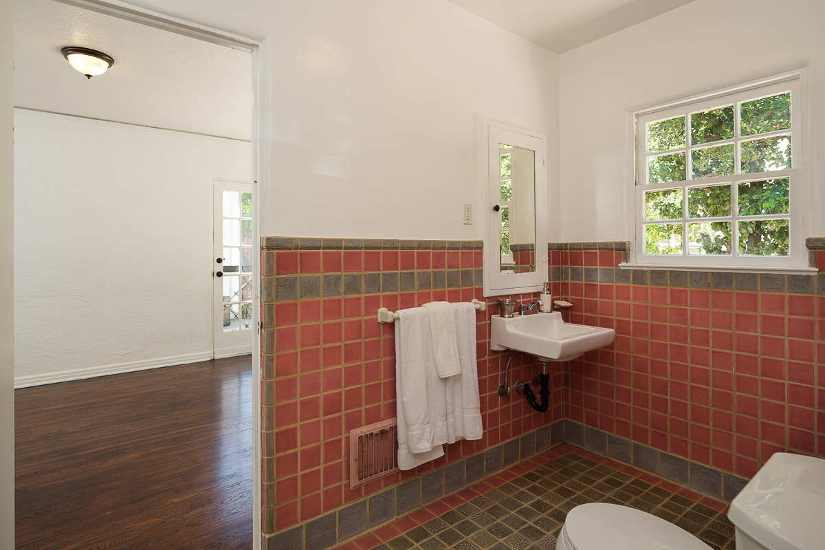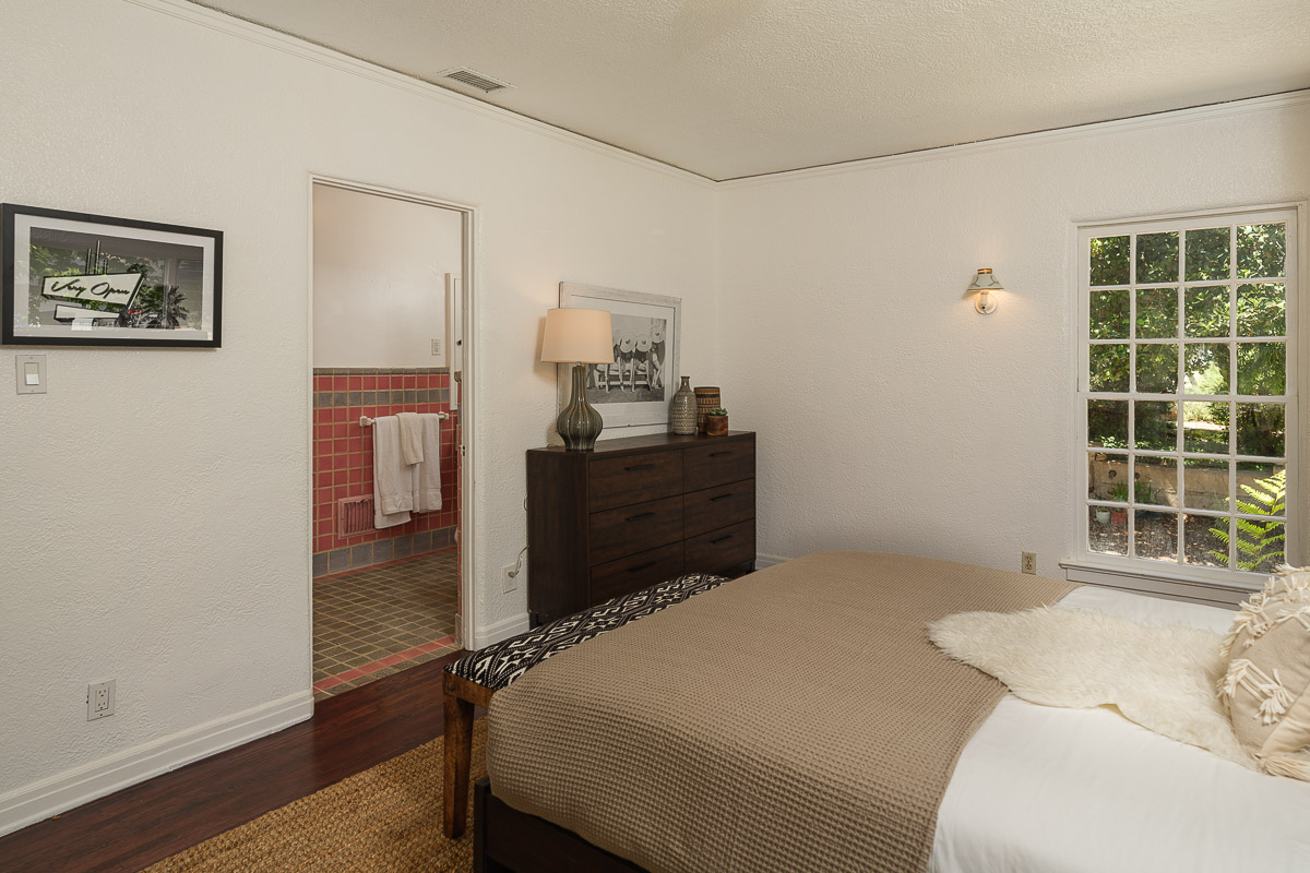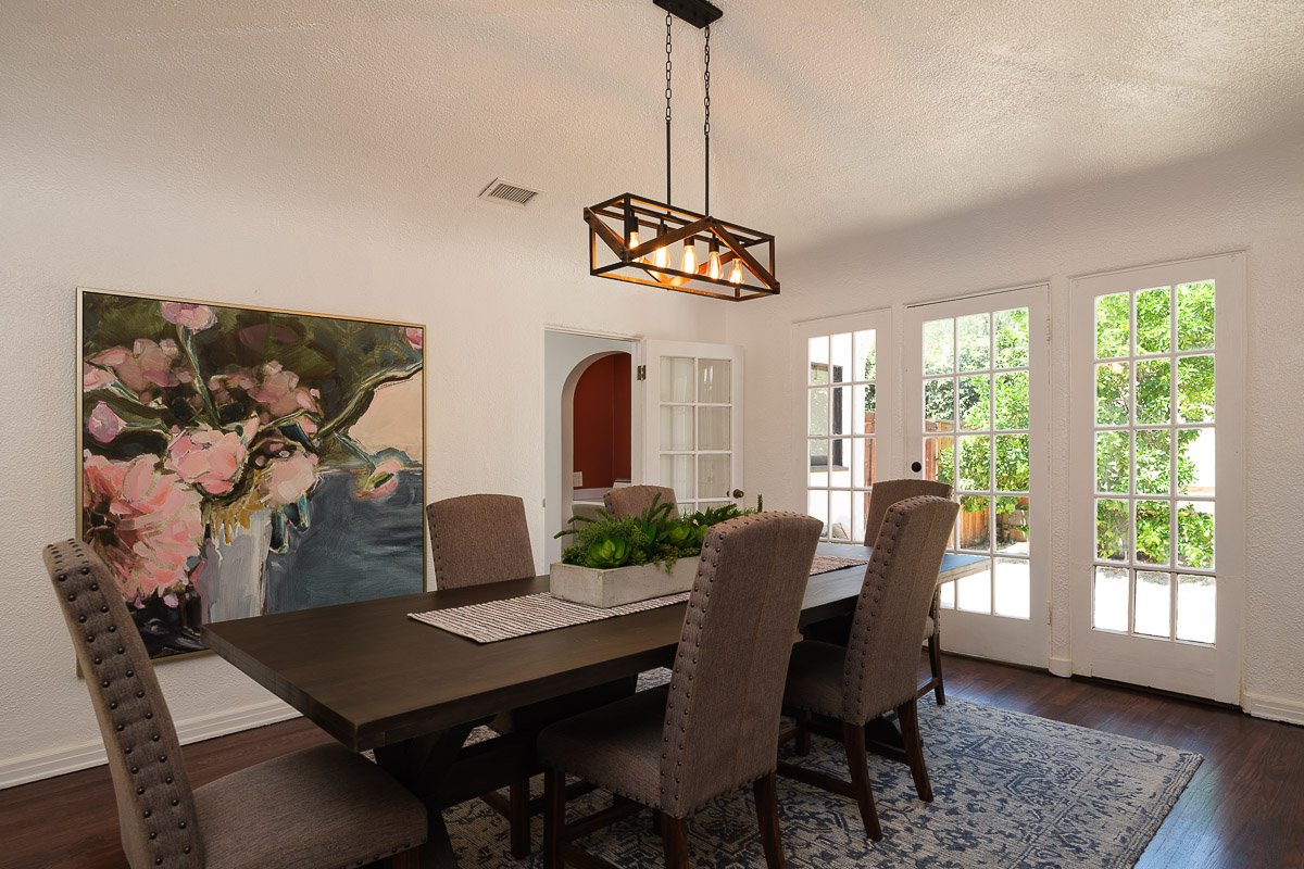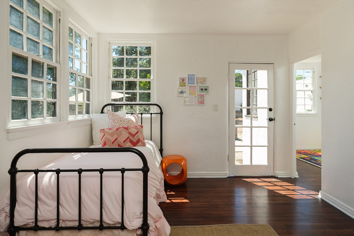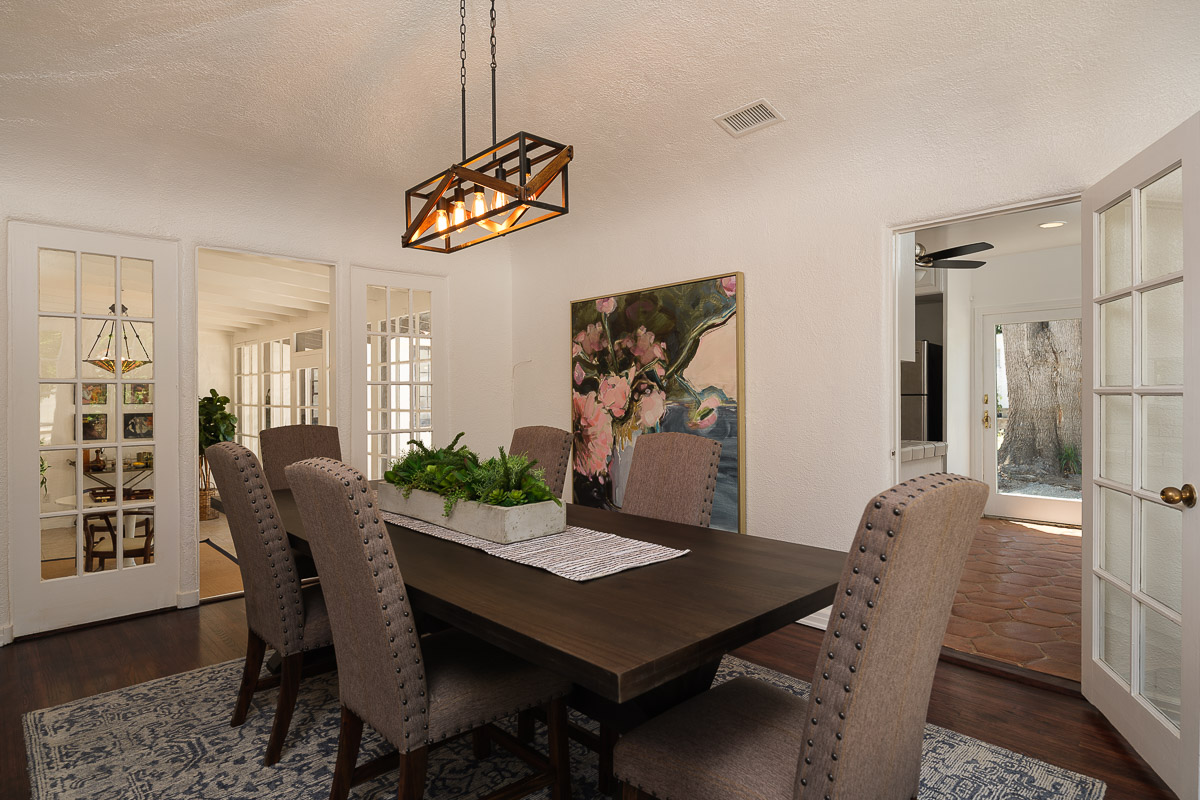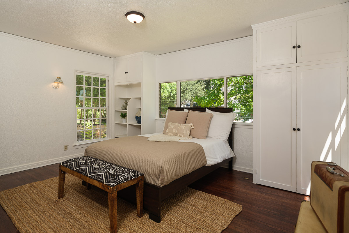 The residence has incredible character details throughout. You are welcomed in via an expansive living room with a soaring arched front window and tall ceilings. From there you step up to the formal dining room, wrapped in windows, that leads to a light filled sun or family room, with wide cross beams, and a wall of windows. There is a sunlit kitchen with white cabinetry, a built-in office nook and handcrafted hexagonal, Saltillo tile. In addition, there is a large utility or laundry room. The interior is filled with old-world, architectural details including period fixtures, a stately fireplace, 1920’s tile, gleaming polished wood floors and so much more.