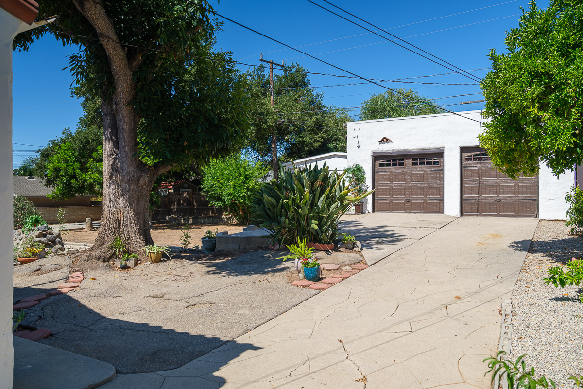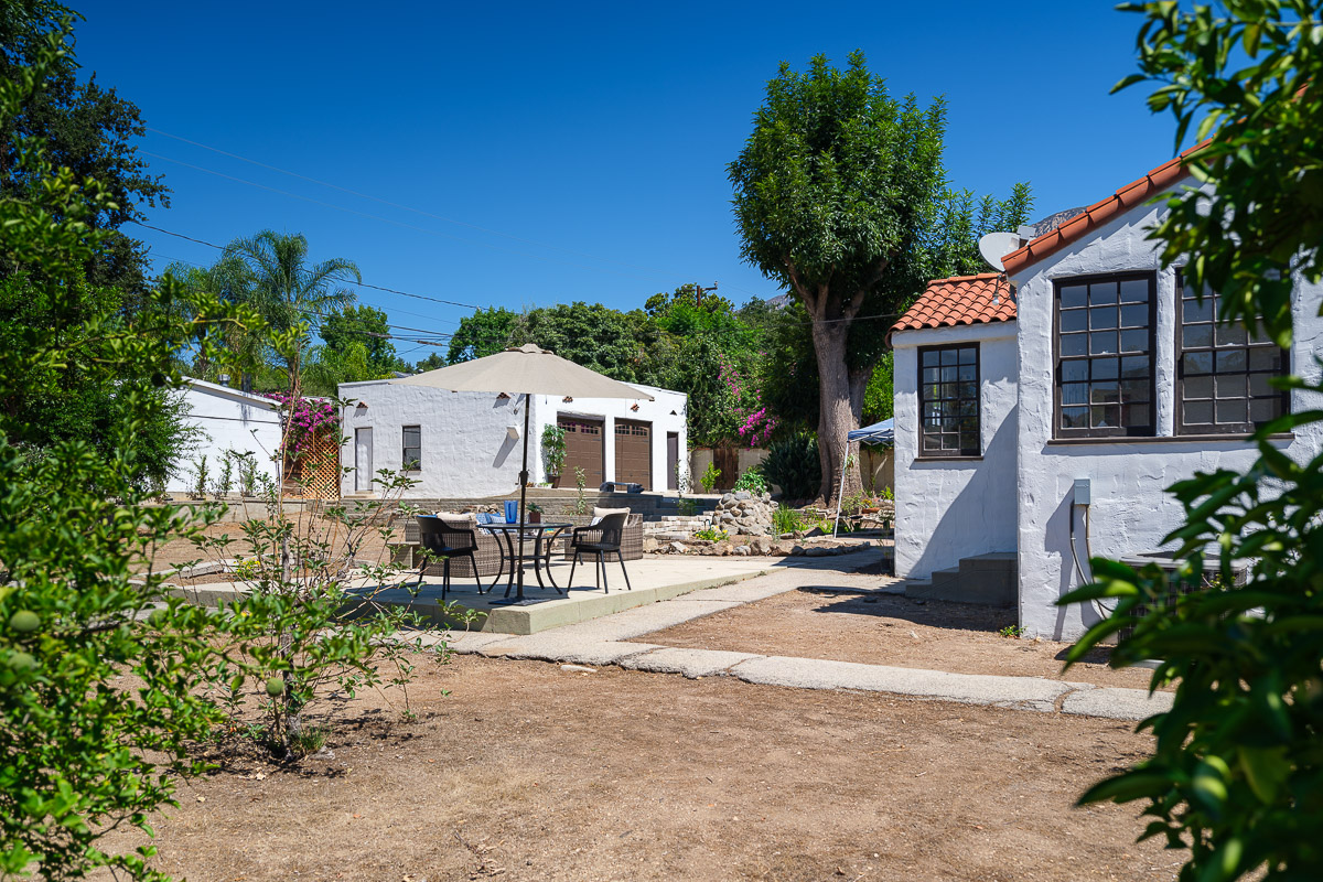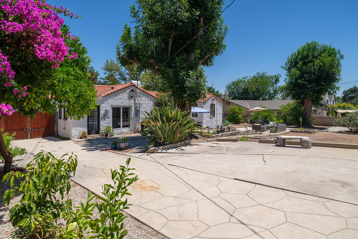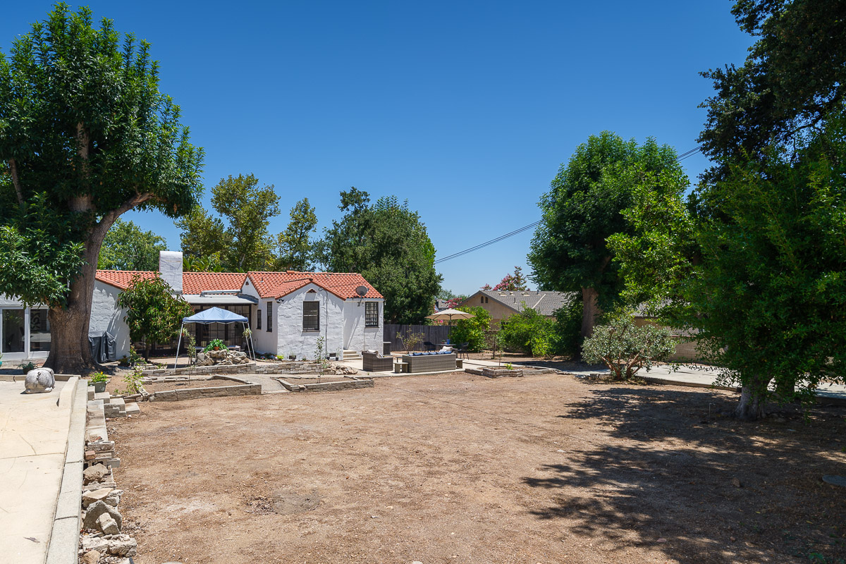 The rear of the home opens out to the step-down patio and yard that has numerous areas for relaxing under the stars or for entertaining friends. The wide 19,782 square foot parcel circles the house and is dotted with patios as well as numerous mature fruit trees that help to offer a feeling of serenity. The sizable backyard has limitless possibilities to create your own retreat.